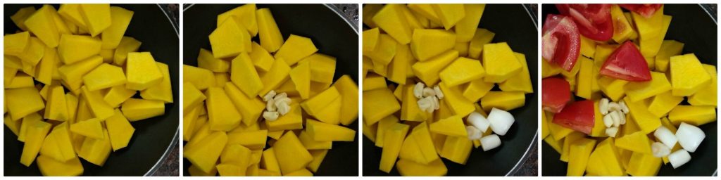 • Pressure cook pumpkin, garlic pods, onion and tomato with 2 cups of water.