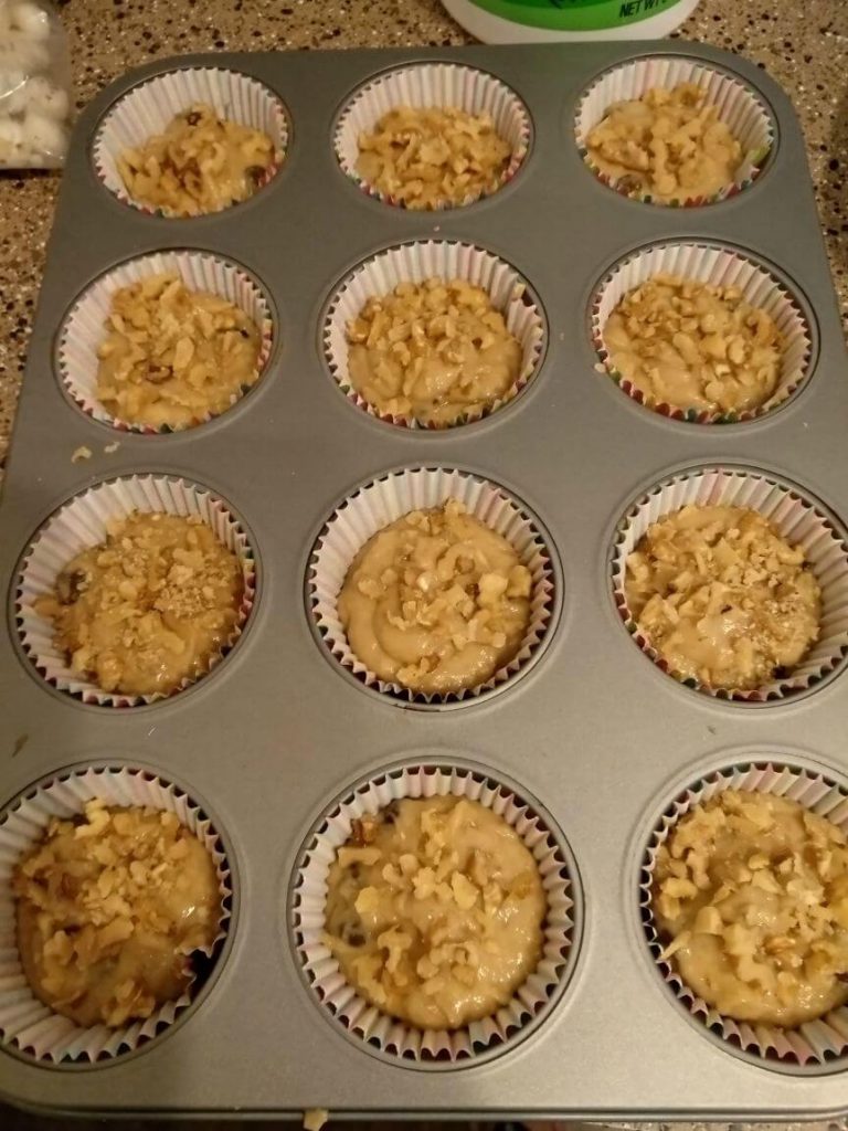 - Line the muffin liners in pan and pour this batter equally. This batter will give 12 muffins. Spread walnuts on top generously. During baking, walnut becomes so crunchier and taste great while chewing muffins.
