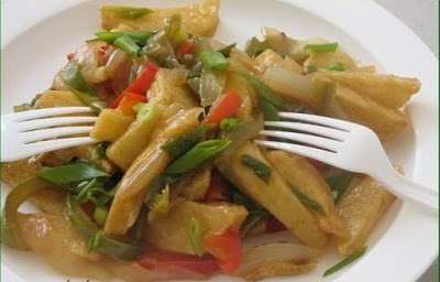 Heat 1 tbs oil in a pan. Add bell peppers & sliced onions. Stir fry them for 4-5 min. After that add ajinomoto, soy sauce and vinegar and mix well.